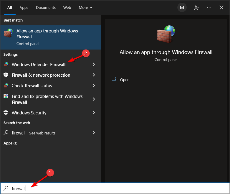 - Откройте поиск и введите firewall, запустите Windows Defender Firewall.