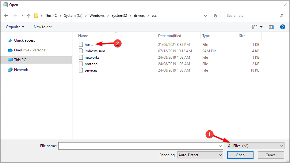 - В Блокноте откройте файл через Файл → Открыть. Перейдите в папку C:\Windows\System32\drivers\etc, выберите Все файлы, затем hosts.