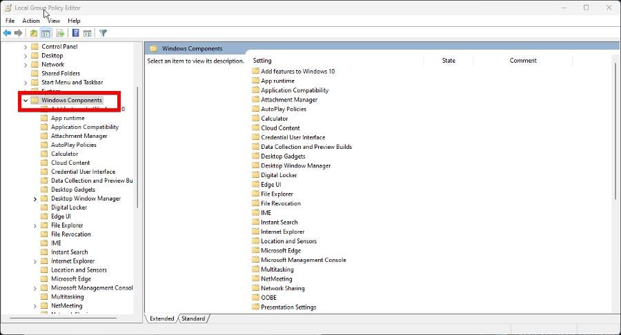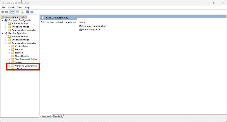 - Перейдите в «Конфигурация пользователя» → «Административные шаблоны» → «Компоненты Windows».