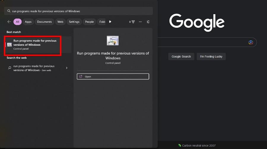 - Откройте меню Пуск и в строке поиска введите «Запустить программу, созданную для предыдущих версий Windows», затем выберите появившийся результат.