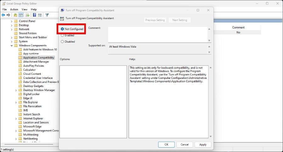 - Дважды кликните политику «Удалить страницу свойств совместимости программы» (или аналогичную), затем установите значение «Не задано» или «Отключено».