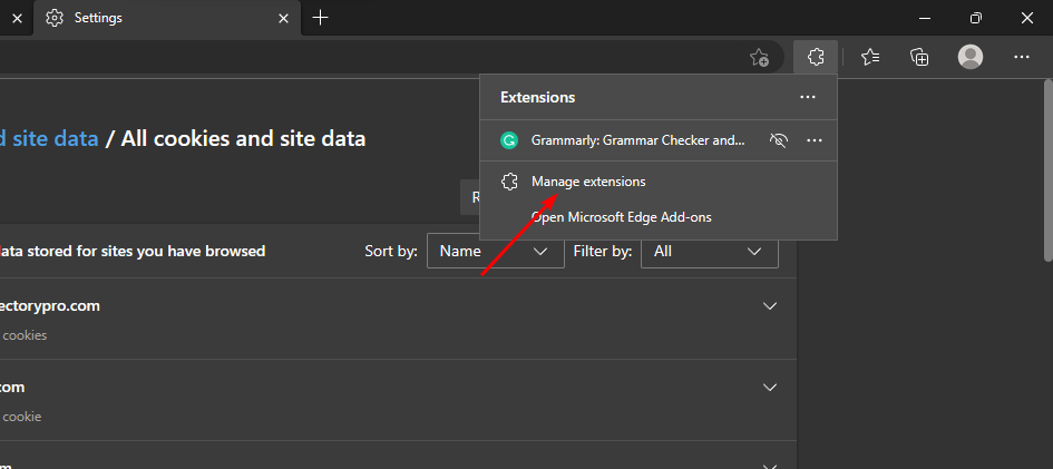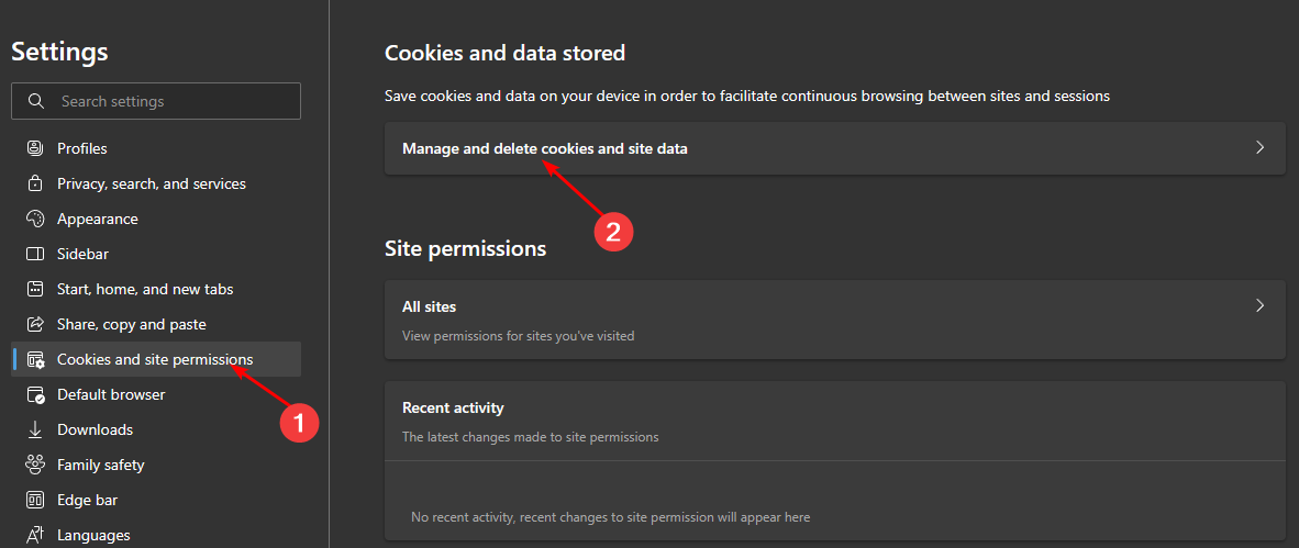 - Перейдите в раздел «Cookies and site permissions» и нажмите «Manage and delete cookies and site data».