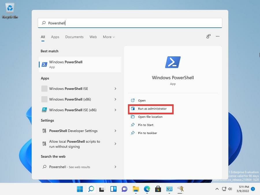 - Откройте Поиск и введите Windows PowerShell.