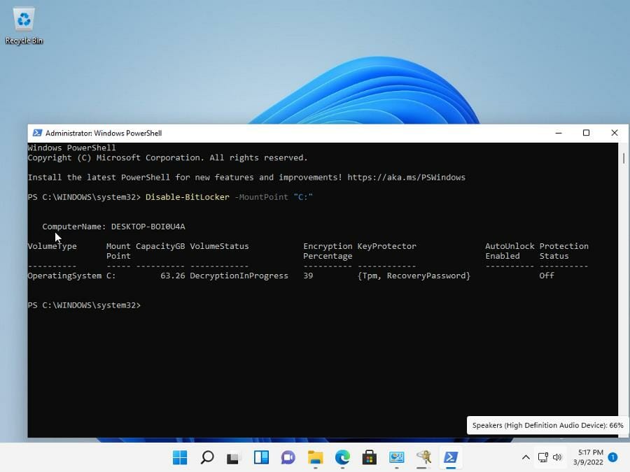 Disable-BitLocker -MountPoint 'C:'