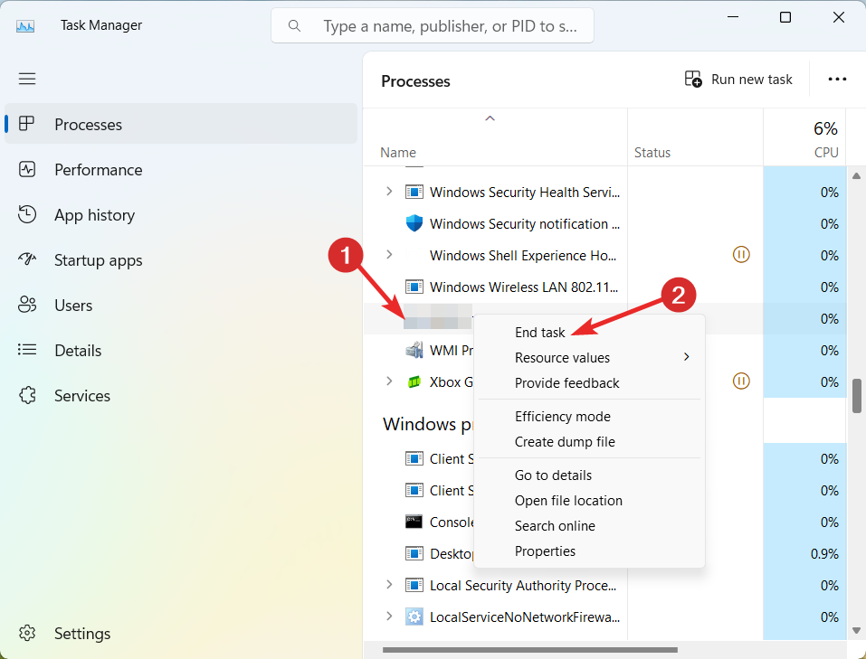 - В списке процессов найдите wscript.exe, wscript.vbs или незнакомые процессы с расширением .exe/.vbs. Правой кнопкой → «Снять задачу».