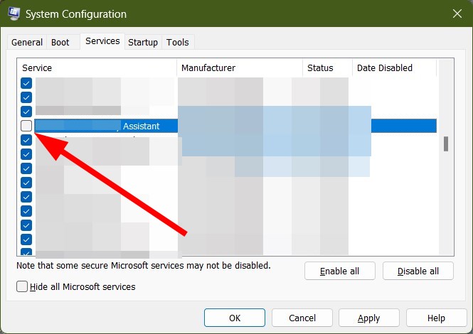 Описание изображения: снятие галочки с службы Dell Support Assistant