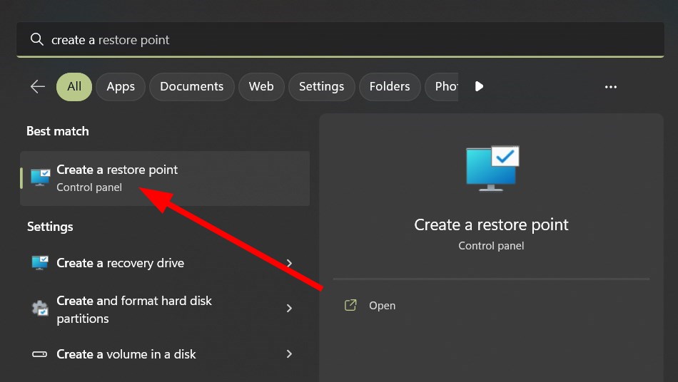 - Откройте меню “Пуск”, найдите “Создать точку восстановления” и откройте.