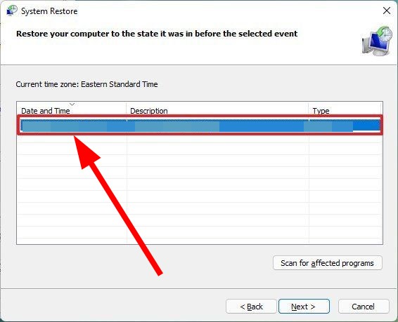 Описание изображения: список доступных точек восстановления с выделением одной из них