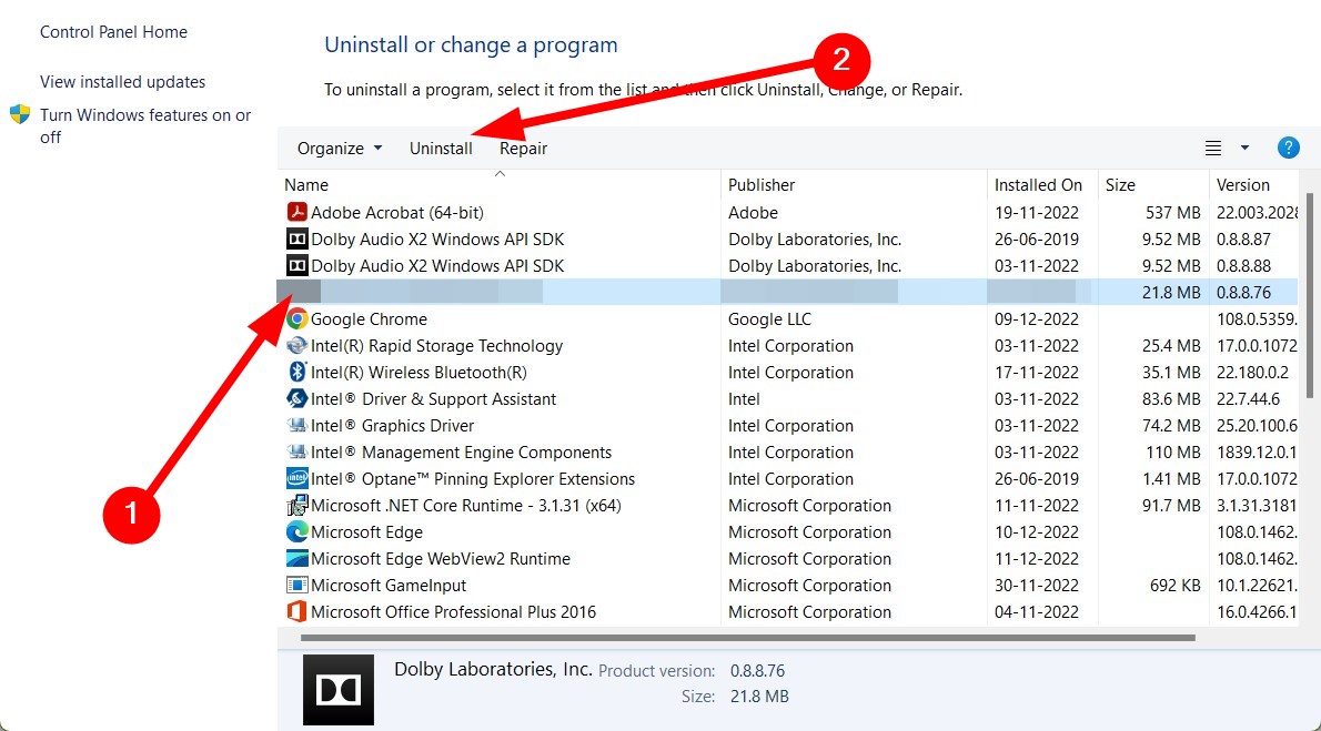 Описание изображения: кнопка удаления Dell SupportAssist в списке программ