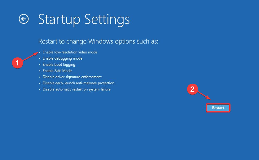 - На экране параметров загрузки выберите «Включить видео в низком разрешении» (Enable low-resolution video mode), обычно это соответствует клавише F1.