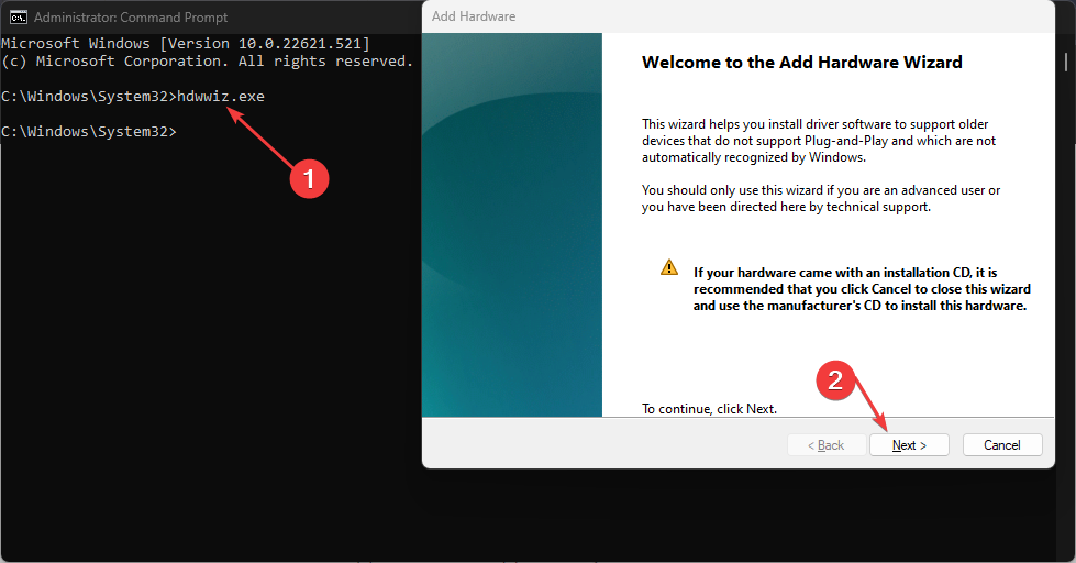 hdwwiz.exeи нажмите Enter — запустится Мастер добавления оборудования.