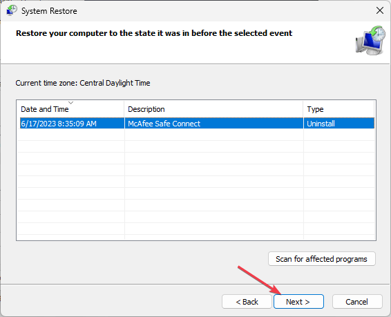 - Следуйте мастеру, выберите точку восстановления до появления ошибки и выполните откат.