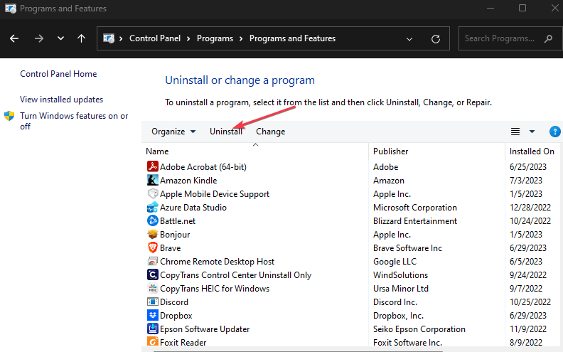 - Перейдите в Программы → Программы и компоненты, найдите недавно установленные приложения и удалите их.
