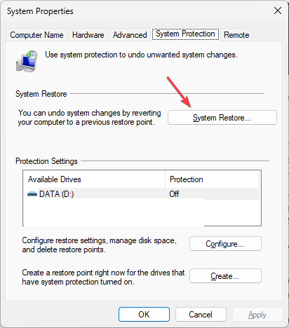 - Нажмите Windows, введите «восстановление» и откройте Создание точки восстановления.
