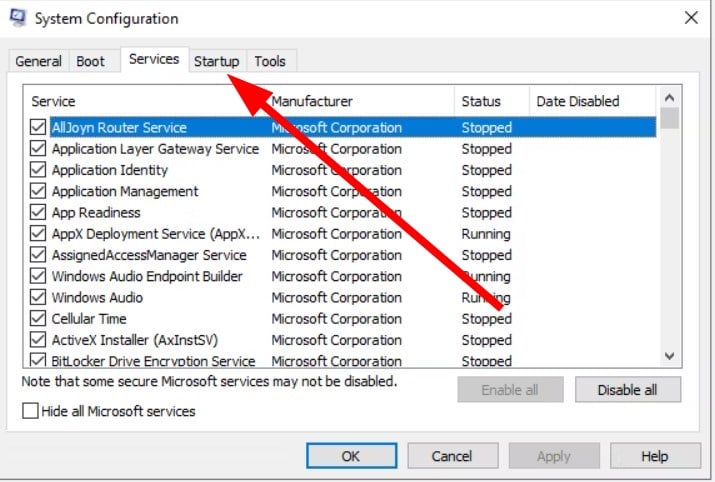 msconfigи нажмите Enter. - Откройте вкладку Службы.
