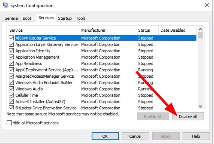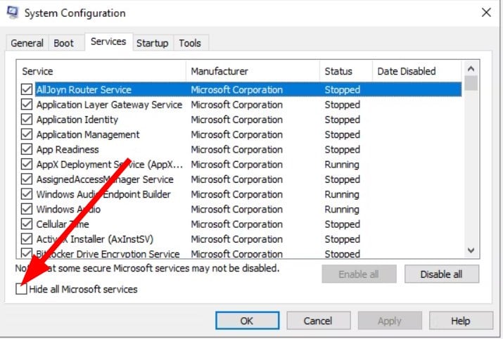 - Поставьте галочку Скрыть все службы Microsoft, затем нажмите Отключить все.