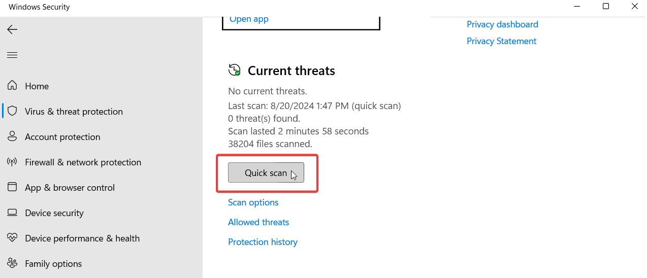 - Откройте Параметры → Конфиденциальность и безопасность → Безопасность Windows → Защита от вирусов и угроз.