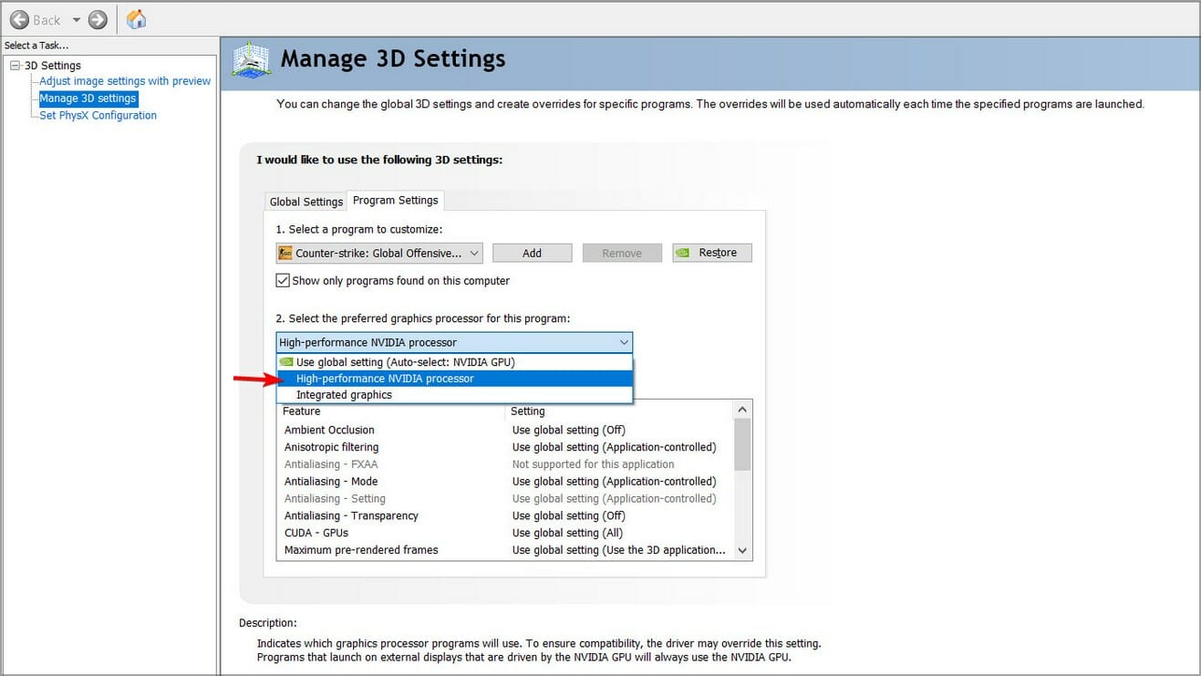 - В выпадающем списке «Предпочитаемый графический процессор» выберите «Высокопроизводительный процессор NVIDIA».