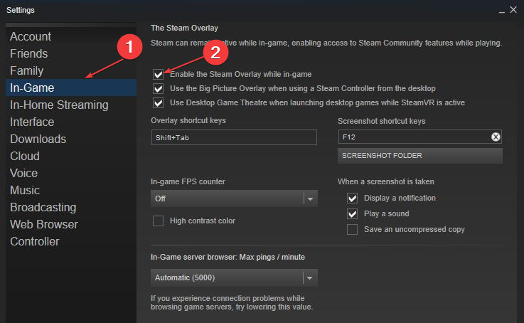 - В Steam включите Steam Overlay, если игра требует взаимодействия с библиотекой/овером.