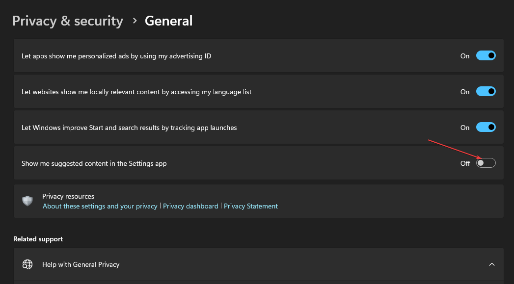 - Отключите переключатель «Показывать предлагаемый контент в приложении Параметры».