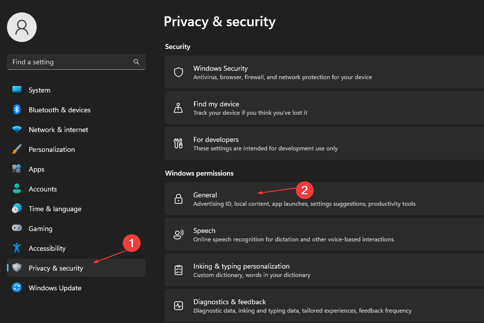 - Перейдите в «Конфиденциальность и безопасность» → «Общие».