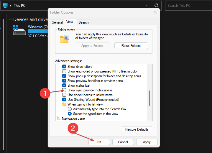 - В окне «Параметры папок» на вкладке «Вид» снимите флажок «Показывать уведомления поставщика синхронизации» и нажмите OK.