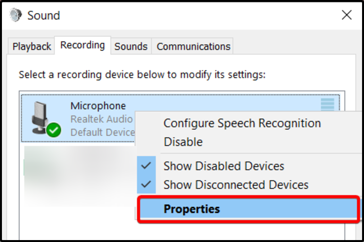 - Щёлкните правой кнопкой по вашему микрофону и выберите Свойства.