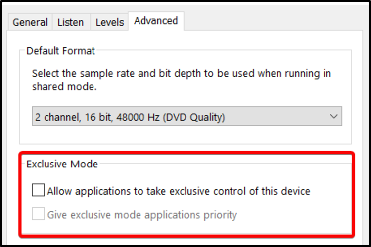 - Оставлять включённой опцию эксклюзивного управления приложением. Решение: отключите её.